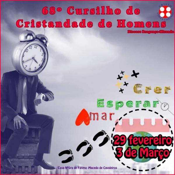Vai realizar-se, entre 29 de fevereiro e 3 de março, o 68.º Cursilho de Cristandade da Diocese de Bragança-Miranda. Será em Macedo de Cavaleiros, na Casa Nossa Senhora de Fátima, e destina-se a homens.