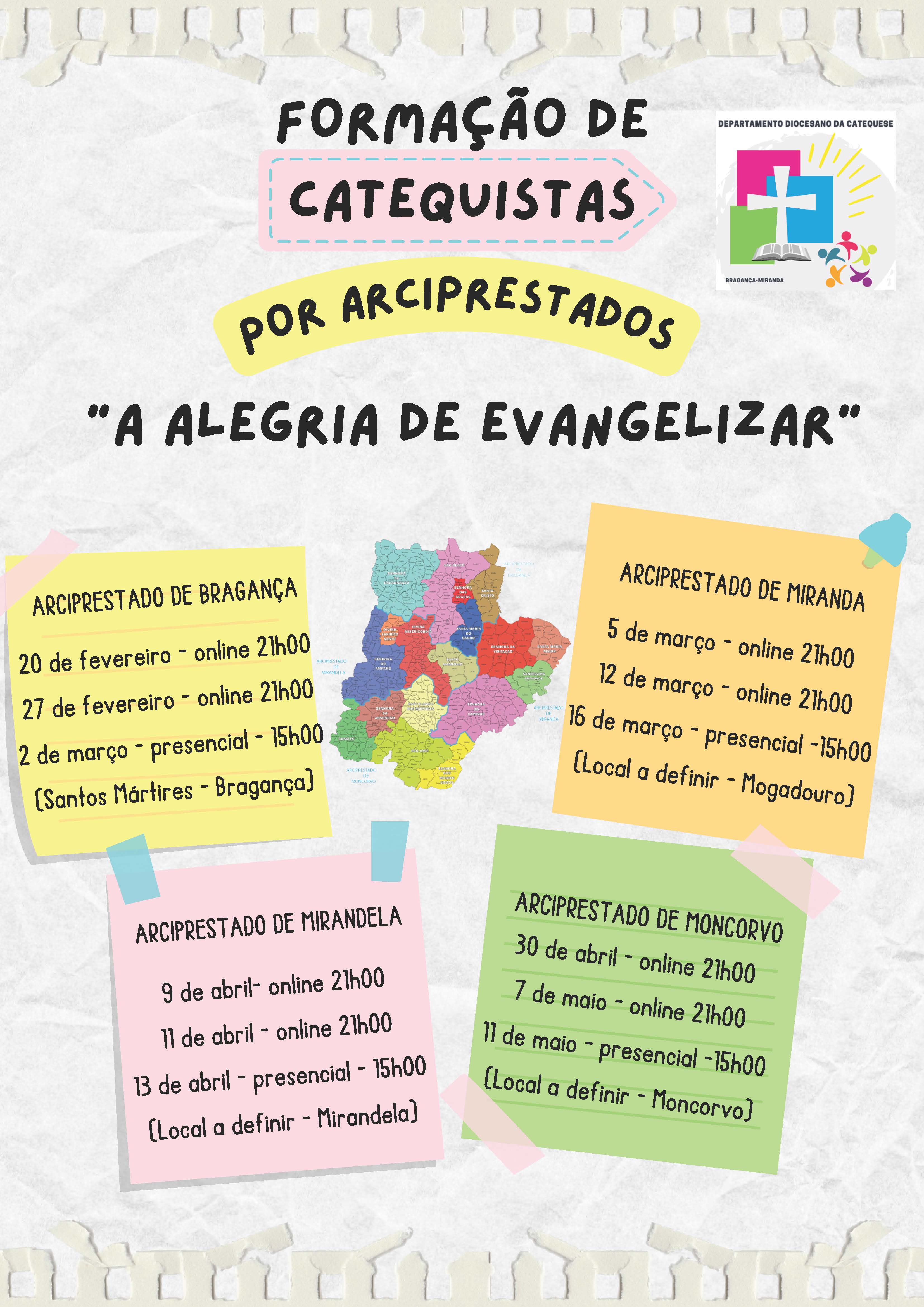 «A Alegria de Evangelizar» é o tema da formação intensiva que o Secretariado da Catequese vai promover, entre 20 de fevereiro e 11 de maio, nos 4 arciprestados da Diocese de Bragança-Miranda.