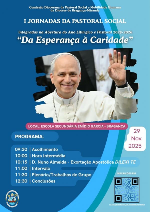 A Comissão da Pastoral Social e Mobilidade Humana da Diocese de Bragança-Miranda promove, no próximo dia 29 de novembro, as Primeiras Jornadas da Pastoral Social, sob o lema “Da Esperança à Caridade”. O encontro, que marca também a Abertura do Ano litúrgico-pastoral 2025-2026, decorrerá no salão nobre da Escola Secundária Emídio Garcia, em Bragança.