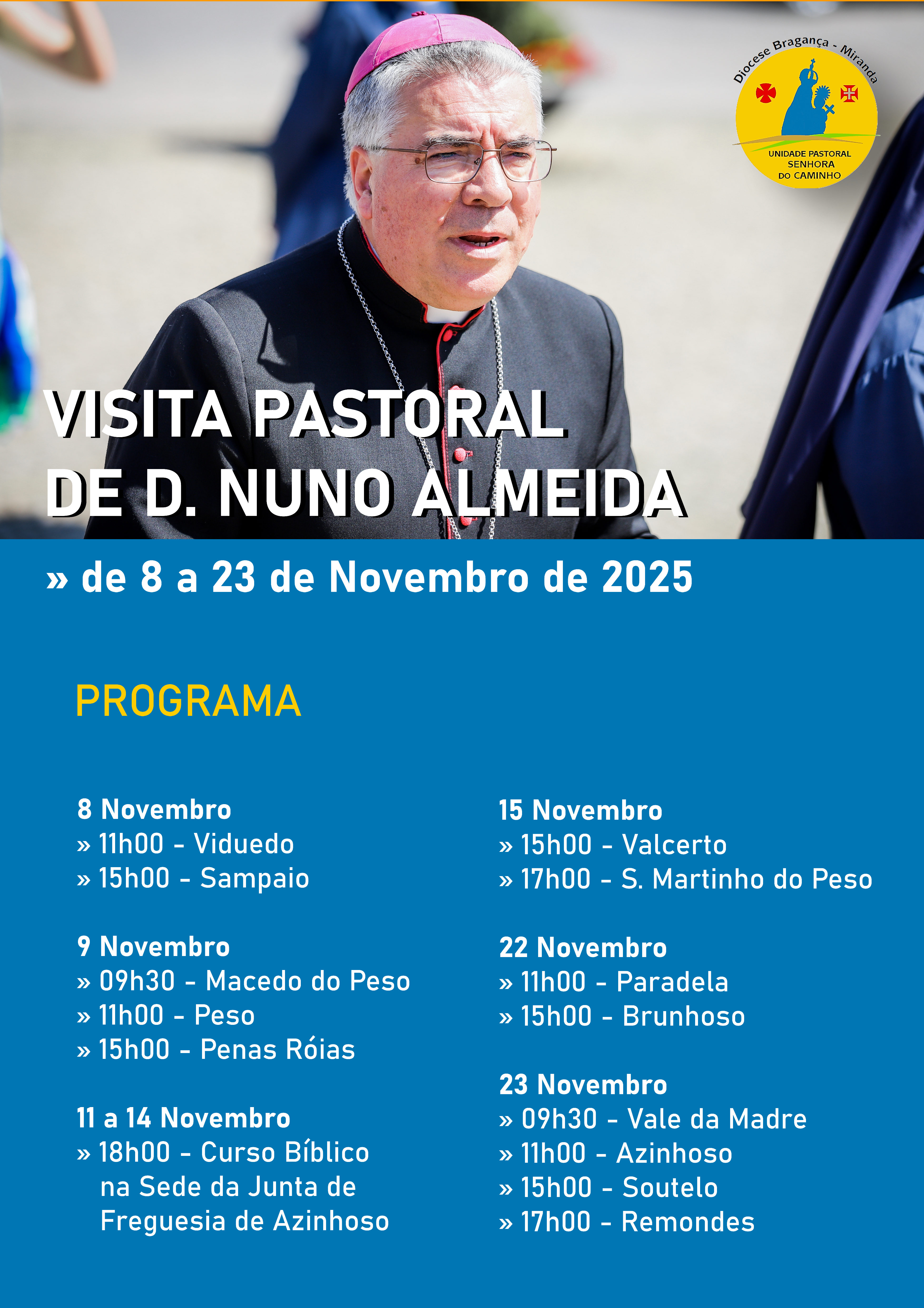 Entre 8 e 23 de novembro, D. Nuno Almeida vai estar em Visita Pastoral ao concelho de Mogadouro, mais concretamente às paróquias confiadas ao Padre Duarte Caldas Gonçalves, na Unidade Pastoral Senhora do Caminho.