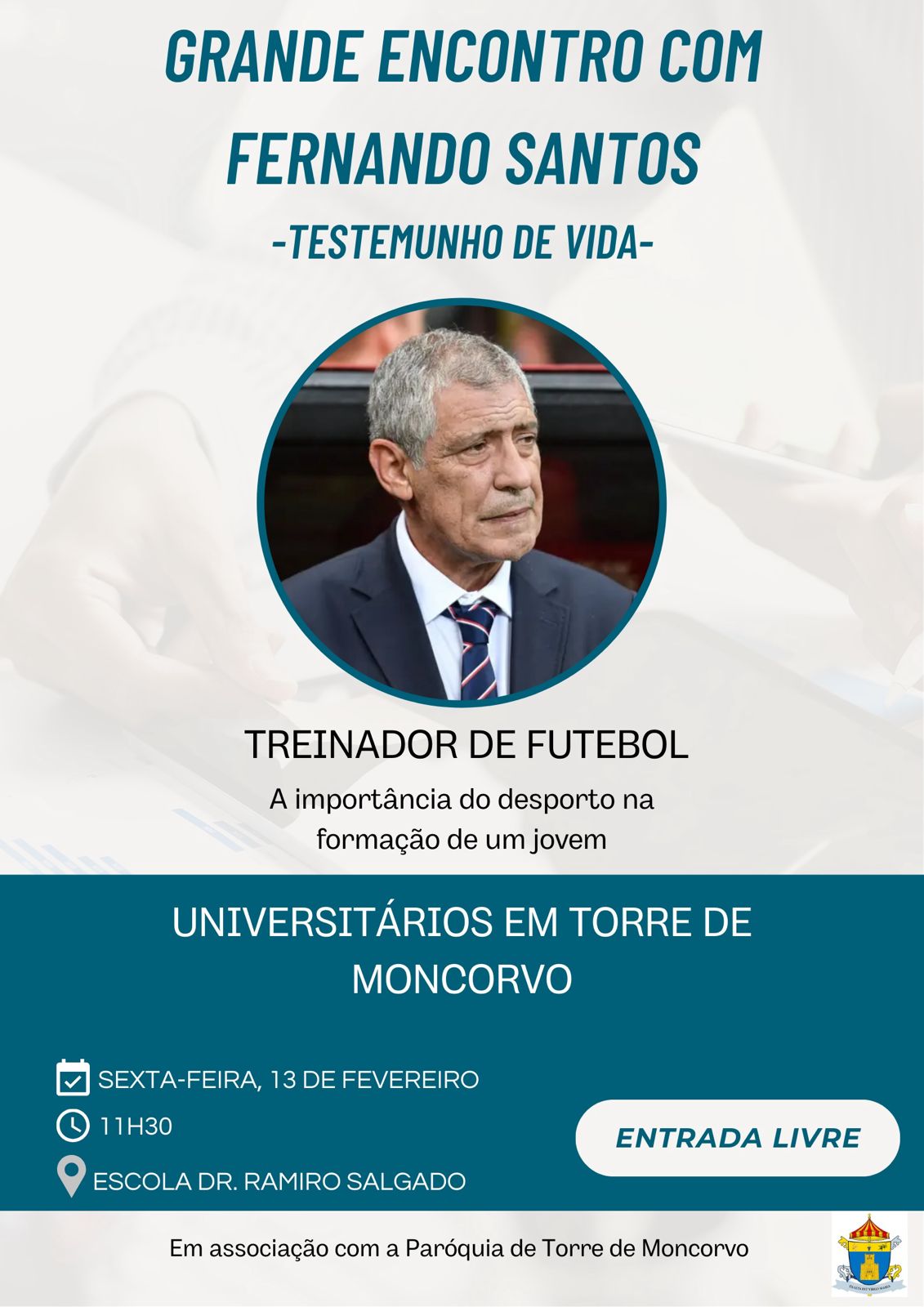 Torre de Moncorvo vai acolher, na sexta-feira, 13 de fevereiro, às 11h30, na Escola Dr. Ramiro Salgado, um encontro especial com Fernando Santos, ex-selecionador nacional de futebol. A iniciativa é promovida por um grupo de universitários do Movimento Comunhão e Libertação, em associação com a Paróquia de Torre de Moncorvo, e promete ser um dos momentos altos destes próximos dias.