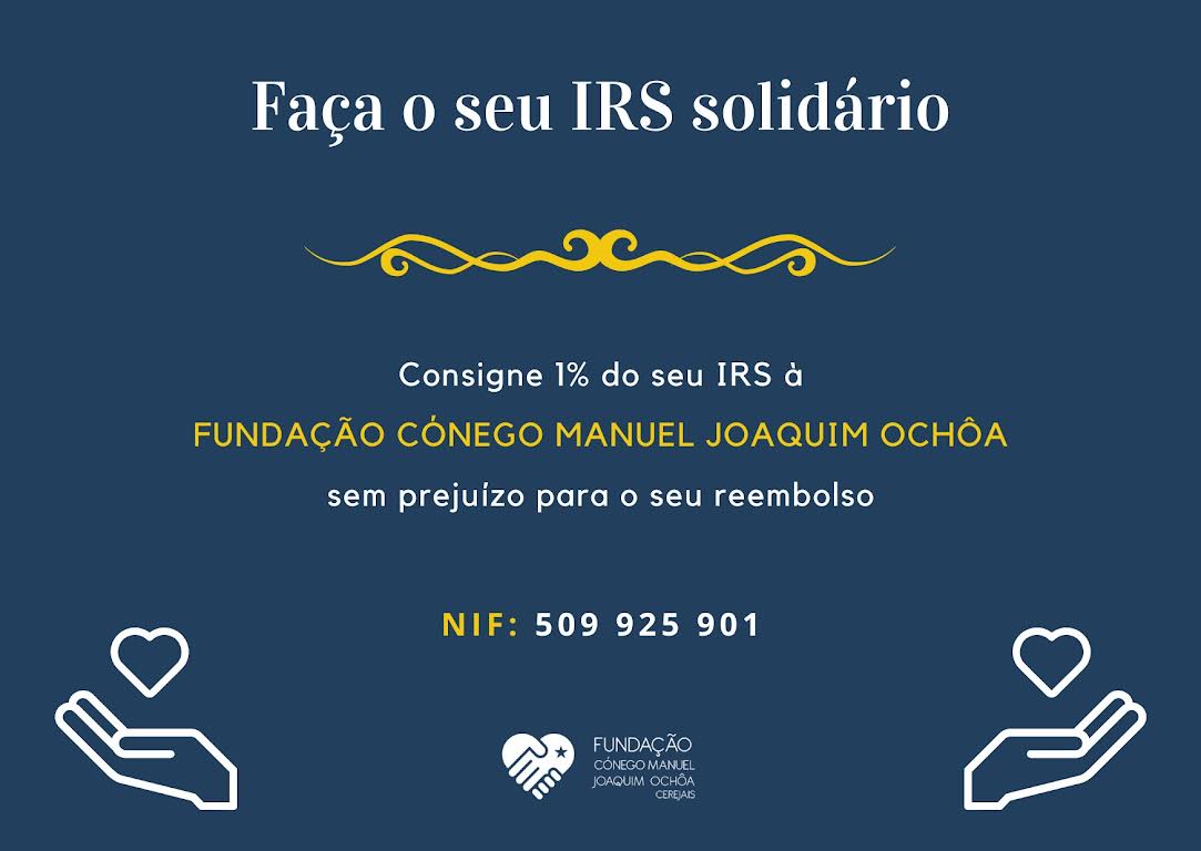 Este ano, ao realizar a sua Declaração de Imposto sobre o Rendimento de Pessoas Singulares, consigne o seu IRS à Fundação Cónego Manuel Joaquim Ochôa e estará a apoiar no cuidado integral, humano e humanizador de cada pessoa, particularmente dos mais frágeis, deste território.