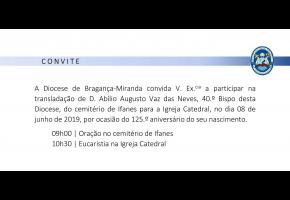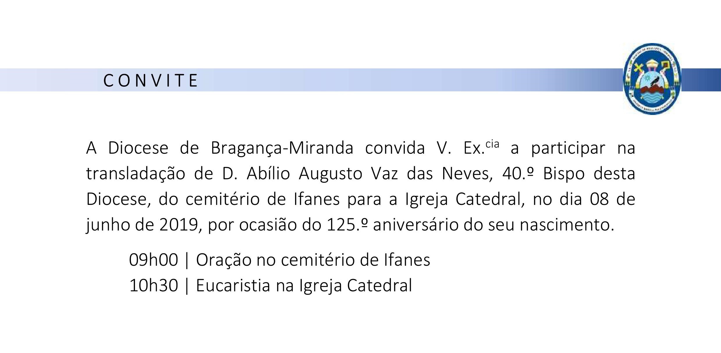D. Abílio Augusto Vaz das Neves, 40.º bispo da Diocese de Bragança-Miranda, vai ser trasladado para a Catedral, em Bragança. A celebração terá lugar a 8 de junho, data em que se assinala o 125.º aniversário do seu nascimento.