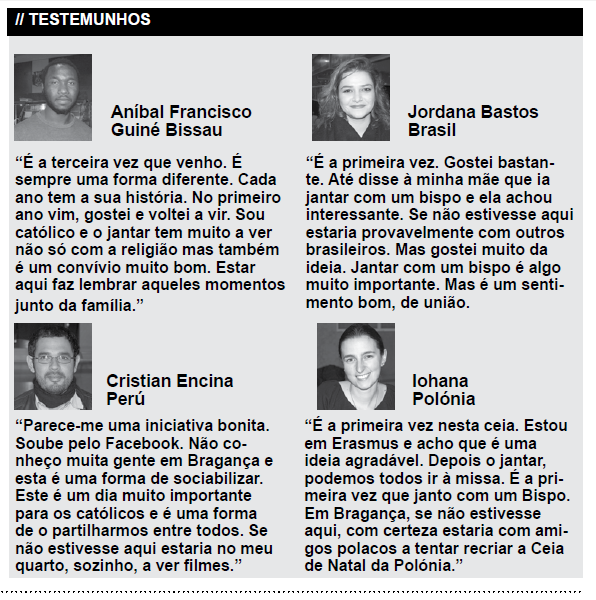 O bispo da diocese de Bragança-Miranda, D. José Cordeiro, pretende alargar a iniciativa que, desde há três anos, junta à mesma mesa os estudantes estrangeiros na noite de Consoada, para um momento de partilha e convívio, a outras pessoas que estejam sozinhas na quadra natalícia.