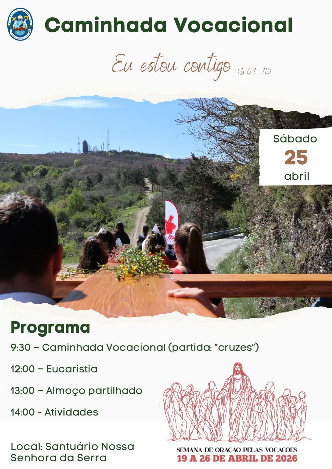 No dia 25 de abril, feriado, jovens e famílias são convidados a participar numa Caminhada Vocacional até ao Santuário de Nossa Senhora da Serra. A partida está marcada para as 09h30, junto às Cruzes, sendo a Eucaristia celebrada às 12h00. Segue-se um almoço partilhado e uma tarde com atividades lúdicas. A esta iniciativa associam-se também, nesse dia, os diocesanos que integram o Seminário Maior Interdiocesano, em Gondomar.